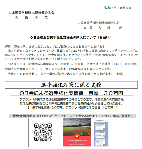 OB会員のみなさまにおかれましては、会費及び選手強化支援金納入にご協力いただきますよう、よろしくお願いします。